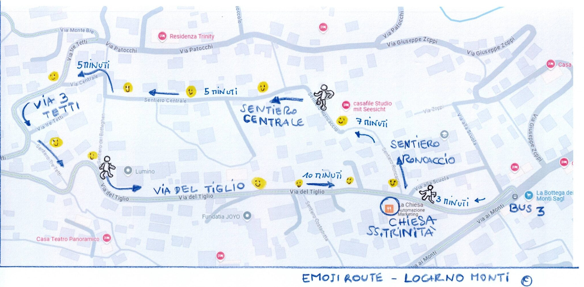 La nostra Emoji route si compone di circa 40 emoji disegnati dai ragazzi di Locarno Monti. “disegna il tuo emoji preferito, e inventane uno nuovo” è un percorso ad anello, che parte dal sentiero a destra della Chiesa e dura circa 30 minuti. È visitabile in ogni momento della giornata. L’emoji route si raggiunge anche con il bus 3 da Piazza Sant’Antonio, fino alla fermata “Locarno Monti della Trinità”.